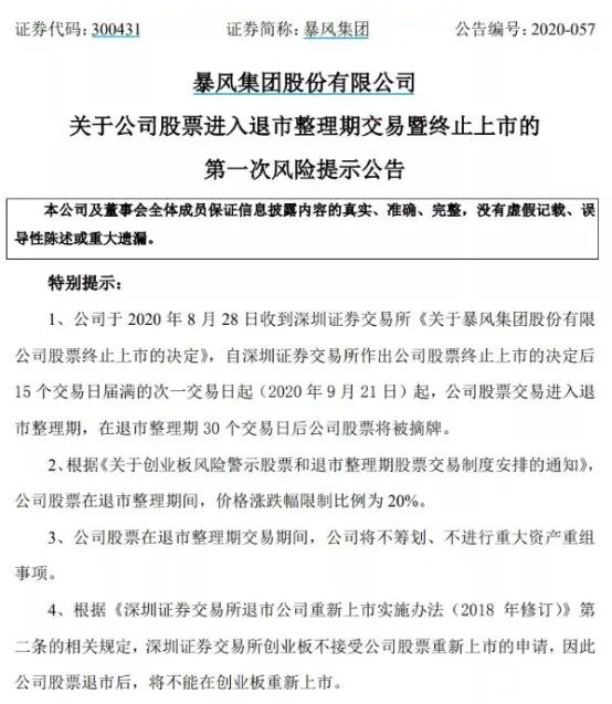 同时,暴风集团也创造了历史,成为创业板注册制下第一只跌幅为20%的退市股。