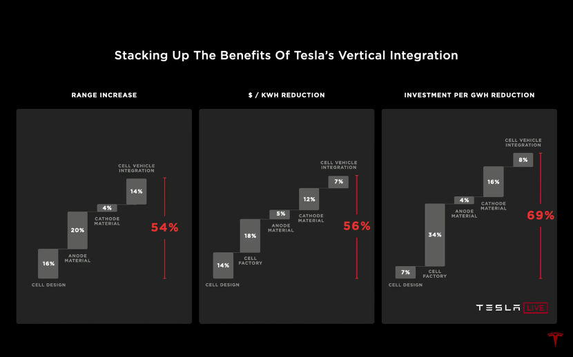 1、电池日发布的5项新电池技术,整体上能使电池续航能力提升50%,且生产成本大幅下降。