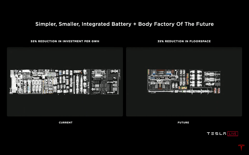 电池和车的一体化方面,特斯拉在电池设计上简化了电池结构,移除了电池组间不必要的部件,使电池体积减少了35%,并将电池放置到底盘的中间位置。新电池结构减少了约370个不必要的电池部件,将降低10%的电池重量并提升14%的续航能力。“未来不使用这种电池结构的汽车生产商将不再具备竞争性。”马斯克自信满满地表示。