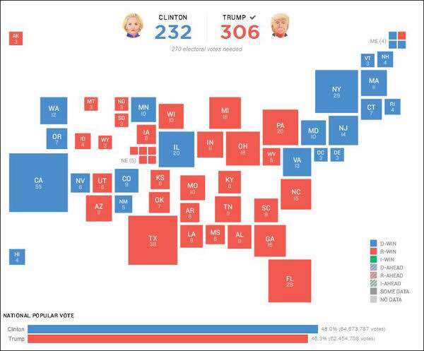 这是因为,特朗普虽然拿到的选民票比希拉里少,但他得到的选举人票数更多。