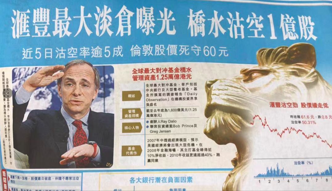 2018年3月,汇丰的股价开始下跌,而且越跌越猛,到10月的时候距离2018年初的高点已经跌去了接近三成。而桥水基金的大佬达里奥称,对此次沽空汇丰的事件负责。