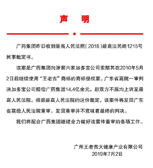 7月2日中午,广药集团通过王老吉官方微博发布声明称,广东省高院一审判决加多宝公司赔偿广药集团14.4亿,后双方不服均上诉至最高人民法院,该案件返回广东省高级人民法院重审。