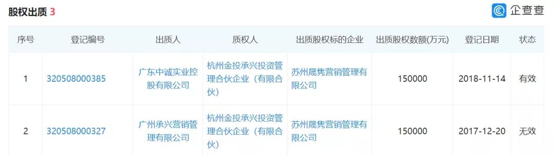 据企查查显示,在2017年12月20日、2018年11月14日,广州承兴两次将苏州晟隽持有的股权全部出质给杭州金投承兴投资管理合伙企业(有限合伙)(下次“杭州金投”,广州承兴为股东之一),出质股权数额约15亿元。