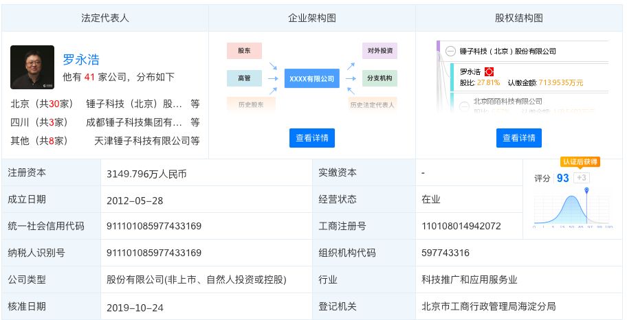 据天眼查信息,锤子科技(北京)股份有限公司的法定代表人、实际控制人是罗永浩。