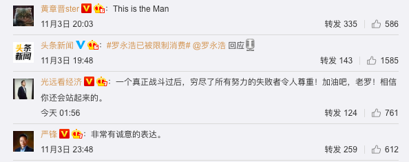 在罗永浩自白微博的评论区,聚集了大批罗永浩粉丝,称其是“体面人”、“充满人格魅力”,甚至有把罗永浩比作项羽的,说他始终不认怂,是个“霸王”,转发里也不乏大V名人的赞美。