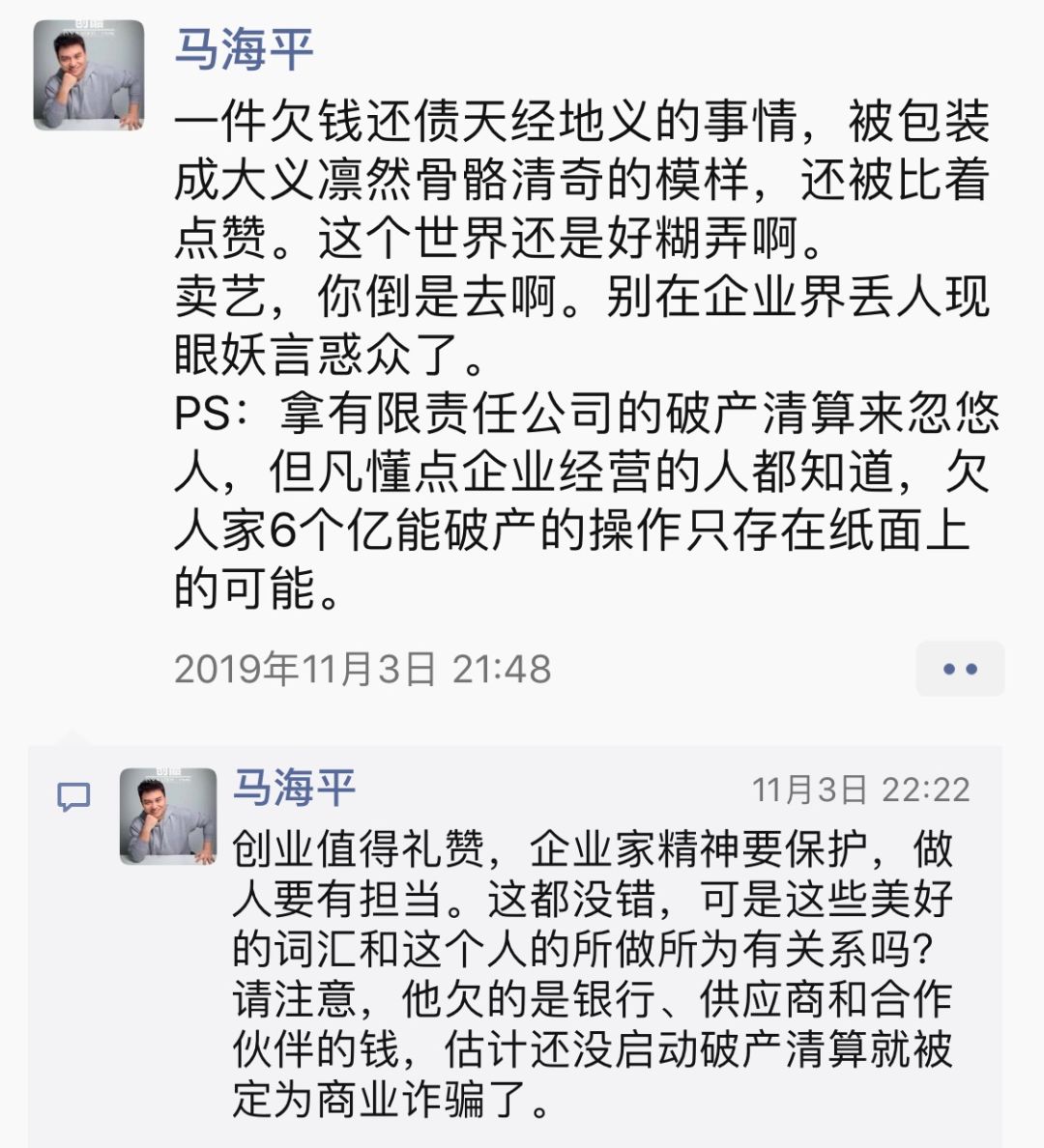 资深互联网人马海平则表示,凡是懂企业经营的人都知道,欠6个亿还能破产的操作只有纸面上的可能。欠银行、合作伙伴和供应商钱,不可能靠破产逃脱。罗永浩的言行会影响大众对创投的看法,“一粒老鼠屎坏了一锅粥。”