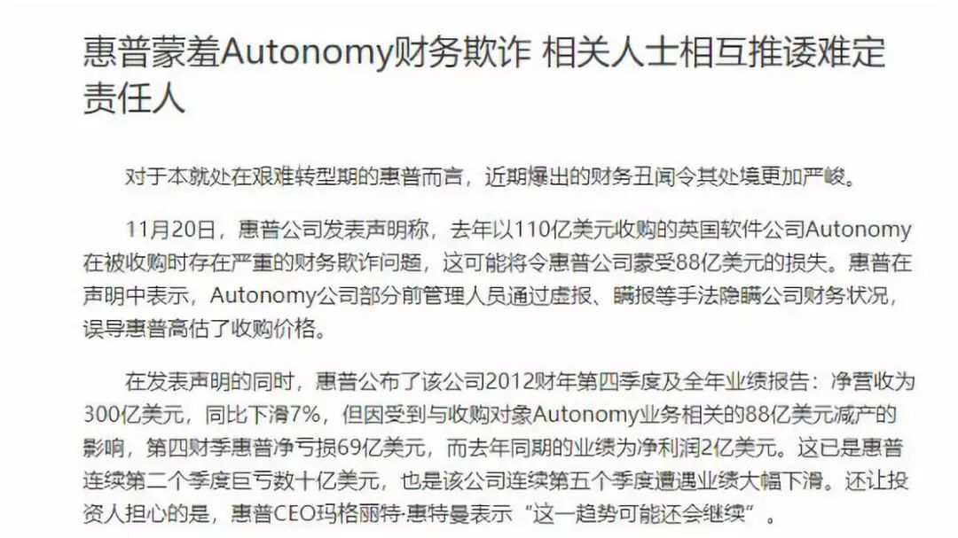 2011年10月,惠普拆借104亿美元并购英国软件公司Autonomy,试图转型为软件服务商。谁知道,落入了财务欺诈陷阱,直接造成了88亿美元的亏损。
