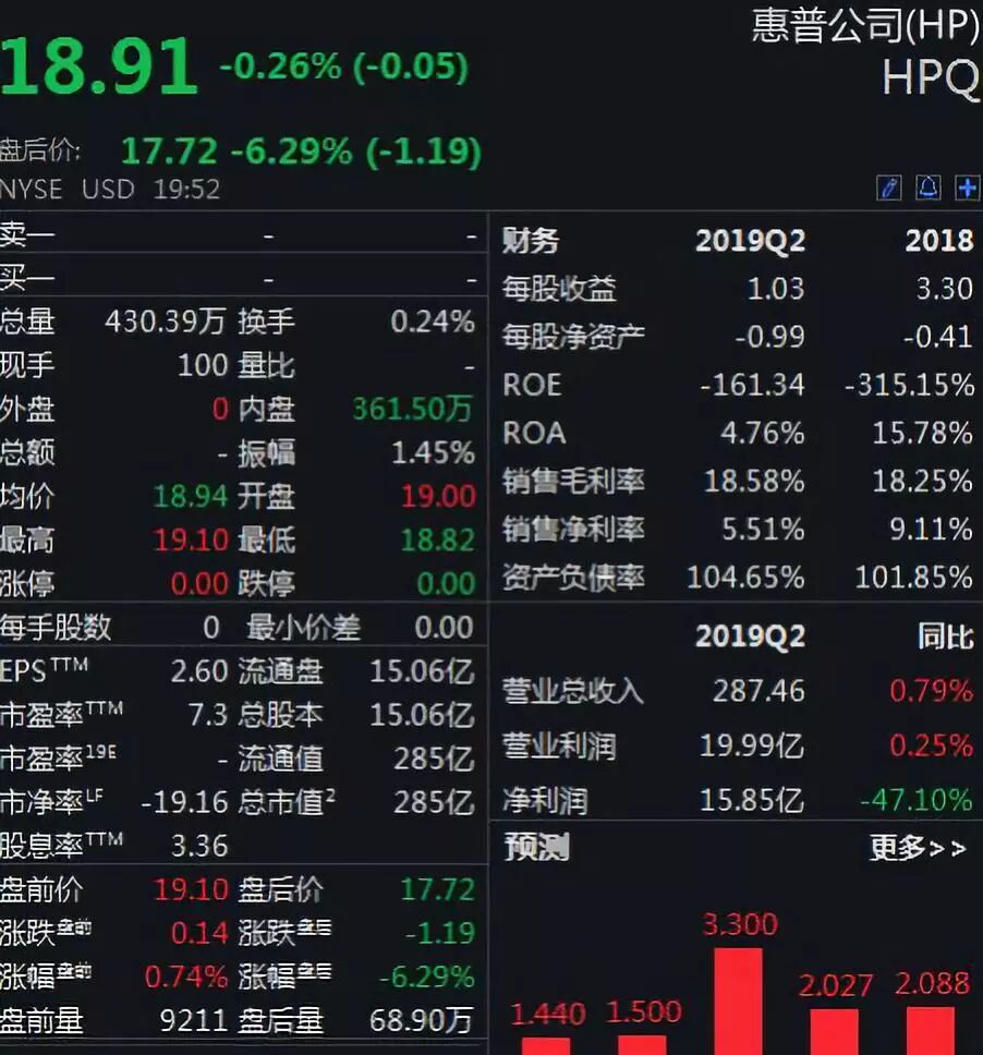 受财报影响,盘后交易中,惠普股价大幅下跌6.29%。