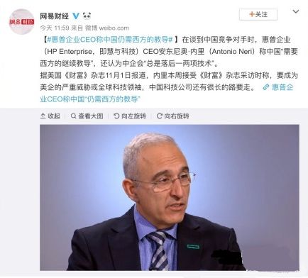有意思的是,惠普企业CEO内里在接受《财富》采访时称,中国企业“总是会落后一两项技术”,中国“仍需西方的教导”。