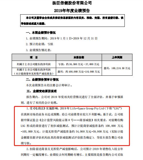 汤臣倍健表示,公司于2018年8月收购的澳洲公司Life-Space Group Pty Ltd(以下简称为“LSG”)在澳洲市场业务未达预期,给公司业绩带来了较大不利影响,预计提商誉减值准备约10亿元-10.5亿元,计提无形资产减值准备5.4亿元-5.9亿元。
