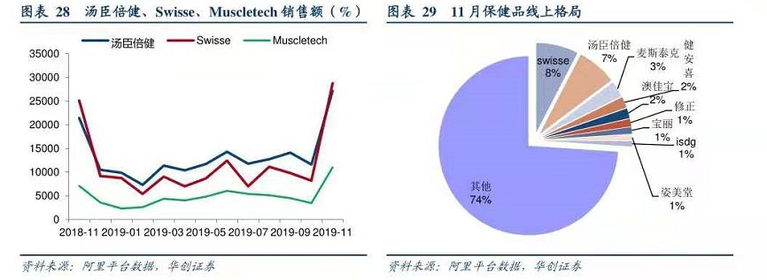 据华创证券分析报告显,2019年11月,阿里渠道保健品销售额38.05亿元,同比增长10.93%;海外保健品11月销售额21.18亿元,同比增长14.18%。其中,保健品线上格局为Swisse占比8%、汤臣倍健占比7%、Muscletech占比3%。