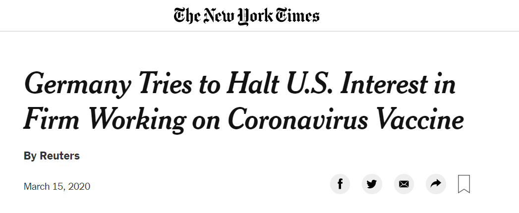 美国和德国之间就正在爆发一场新型冠状病毒疫苗的争夺战。