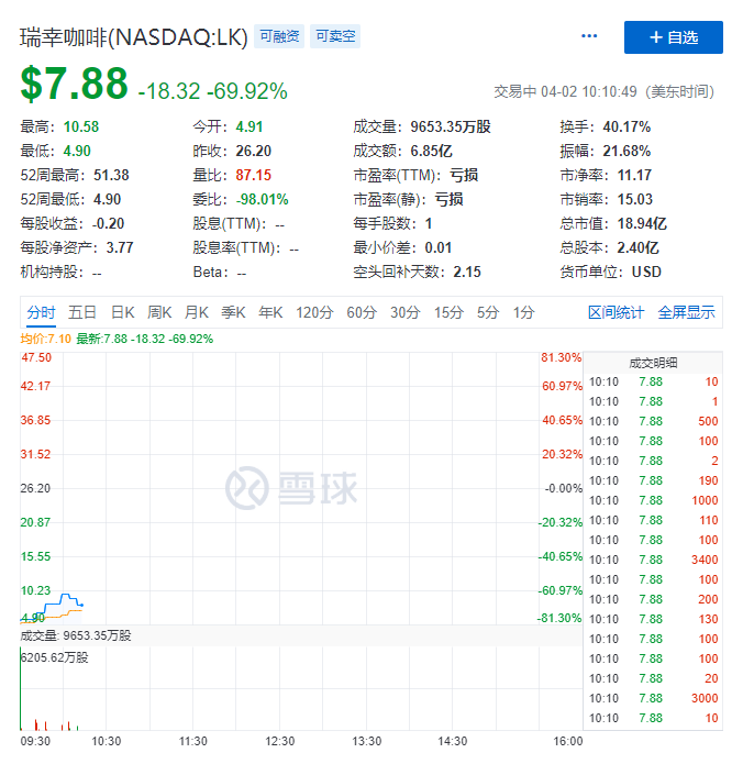 而有意思的是,这次熔断只是瑞幸咖啡股价熔断的前奏,在随后的交易中,截至北京时间21:50分,瑞幸咖啡再度触发两次熔断,截至发稿,瑞幸咖啡日内第三次熔断触发,现跌69%。