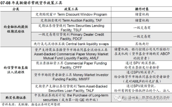 至此,美联储几乎启动了2008年金融危机采用过的所有“救市”措施,而且还有“创新”,下面的两个表格,就是对比美联储在2008年和这次危机中的救市工具及措施。