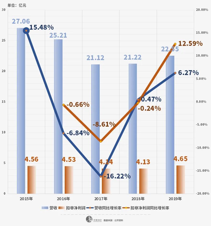 据承德露露财报数据显示,公司自2015年销售收入达到27亿元高点后,业绩连续两年下滑,2018年虽有回升,但依然远不及2015年。2016-2018年,承德露露净利润同样持续下滑,2019年才重新增长,实现净利4.65亿元,与2015年盈利能力相当。