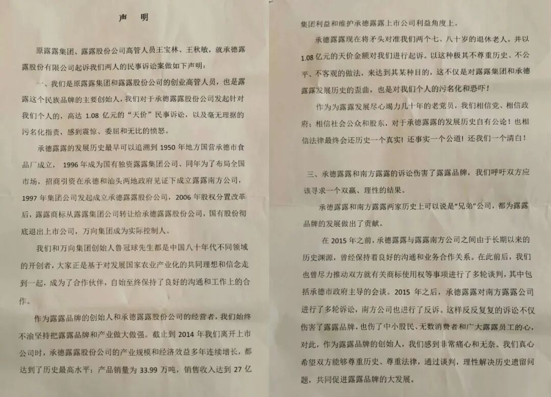 “这样反反复复的诉讼不仅伤害了露露品牌,也伤了中小股民,无数消费者和广大露露员工的心”,王宝林与王秋敏在声明中呼吁谈判,希望“双方能够理性解决历史遗留问题,共同促进露露品牌的大发展”。