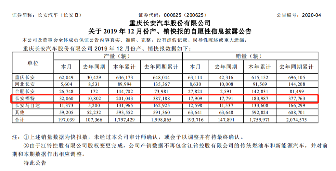 记者从长安汽车产销快报中看到,2019年长安汽车总销量约176万辆,同比下滑15.16%,下滑幅度高于全国汽车销量8.2%的下滑幅度。销量下滑主要来自合资品牌长安福特,其全年仅售出约18.4万辆,同比下跌51.3%。
