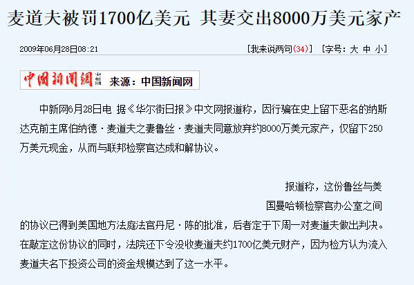 2009年6月29日,纽约联邦法院判处麦道夫150年有期徒刑,没收1700亿美元财产。