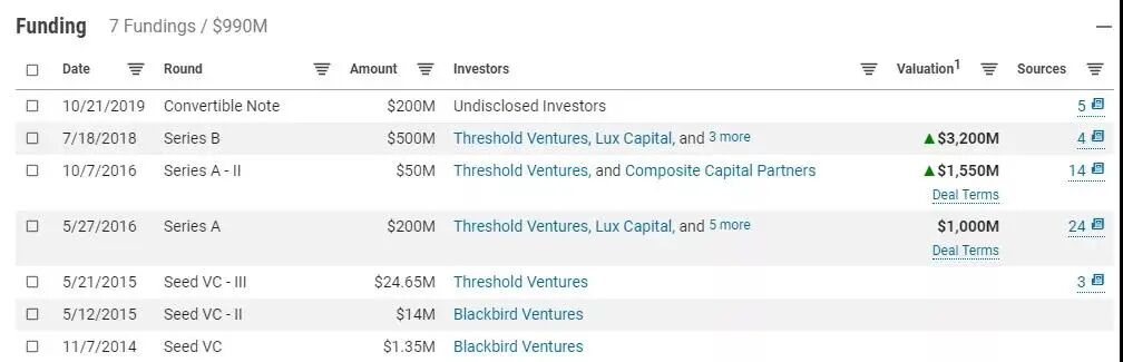 2014年11月,Zoox获得第一笔135万美元的种子轮投资,此后4年5次融资累积获得投资机构7.9亿美元的投入。最近的一笔融资发生在2018年7月,当时B轮5亿美元的融资使得Zoox的估值达到了32亿美元。2019年10月,Zoox又通过发行可转换债券获得了将近2亿美元的资金。