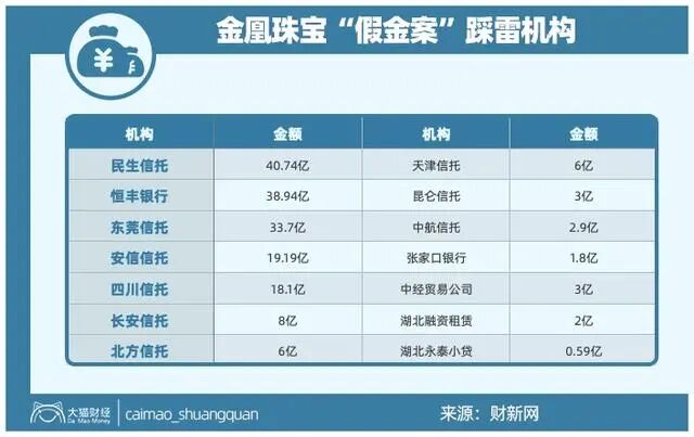 黄金加工公司金凰珠宝,缺钱,找15家信托公司融资,200亿,用自家80吨黄金作为抵押,财务状况恶化,信托公司要求其提前还款,还欠160亿还不上,信托公司开箱验货,发现黄金是假的。