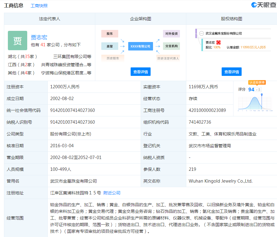 天眼查显示,金凰珠宝,全称为武汉金凰珠宝股份有限公司,是一家来自武汉的企业,2002年成立。金凰珠宝实控人为贾志宏,其名下总共有41家公司。