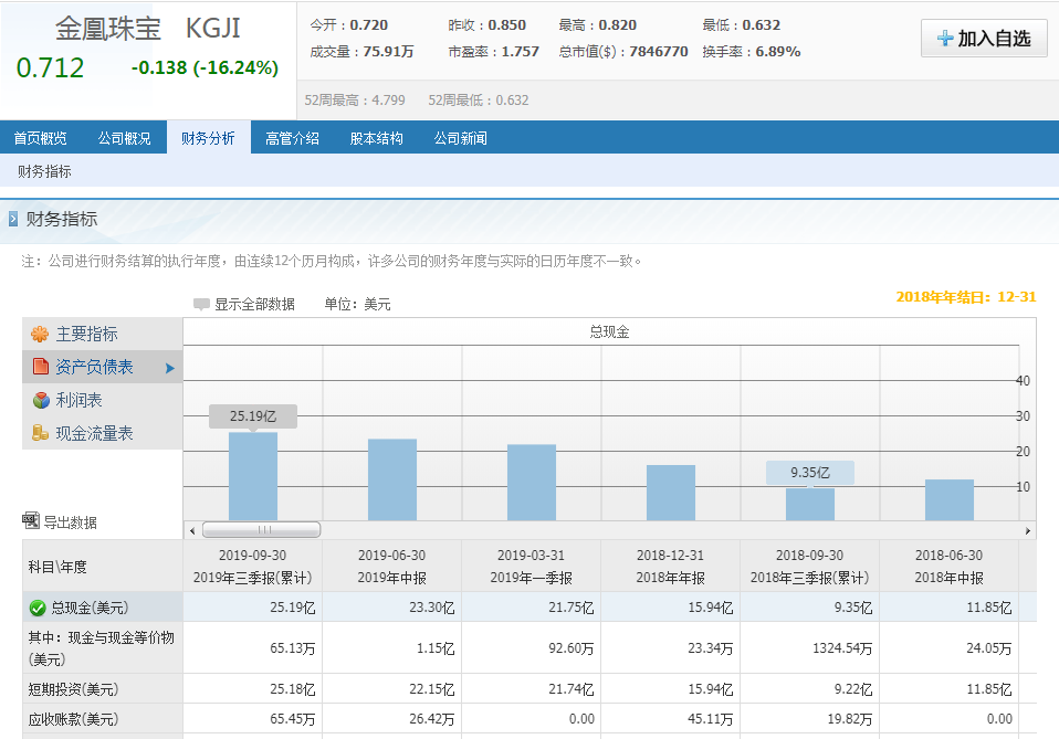 昨天,金凰珠宝的股价继前一个交易日大跌之后,再次下挫16.47%,最终收盘价已经来到0.71美元每股,离71.22美元的最高价已经只剩不到零头了。