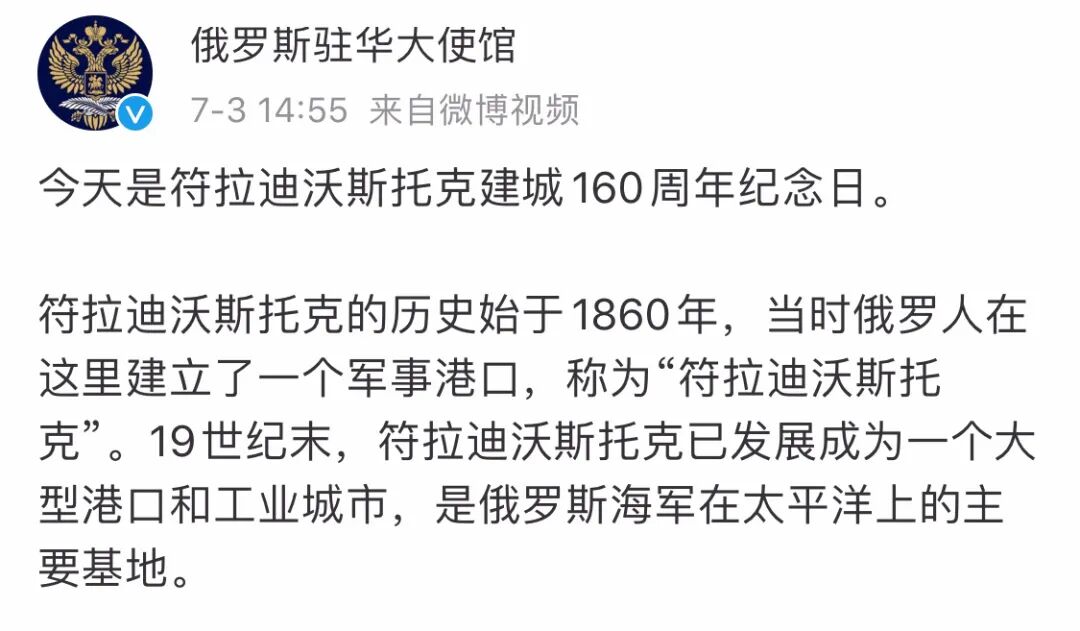 前几天俄罗斯驻华大使馆发了一个纪念符拉迪沃斯托克(海参崴)建市160周年的纪念微博,让不少国人感到不快,在我看来其实没必要。