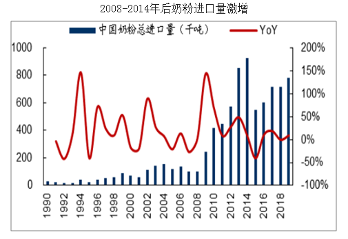 根据网络公开的数据,2008年及之前,奶粉的进口量一直处于低位,进口奶粉相比于国内奶粉并不占优势。