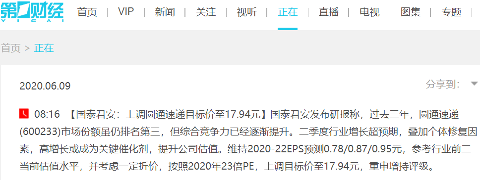 国泰君安则根据行业估值水平,将圆通的目标价上调至17.94元。