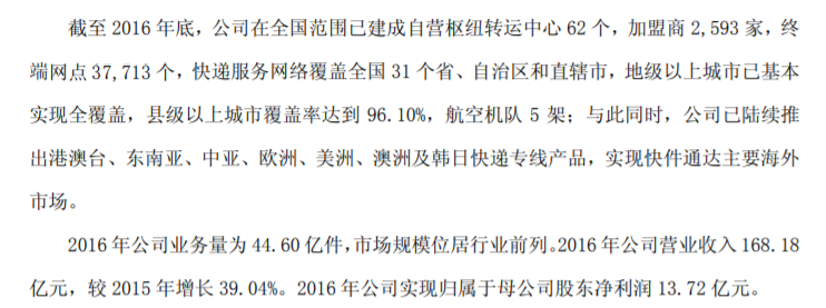 通过率先绑定淘宝系,圆通速递快速步入了“低价—巨大单量—规模经济—成本降低—低价获取单量”的良性循环。在2015年,它成为了快递行业的龙头,还引入了阿里巴巴和云锋基金作为公司的战略投资者。到2016年,得益于领先同行的37713个网点数量,圆通已经实现了168.2亿元营业收入。