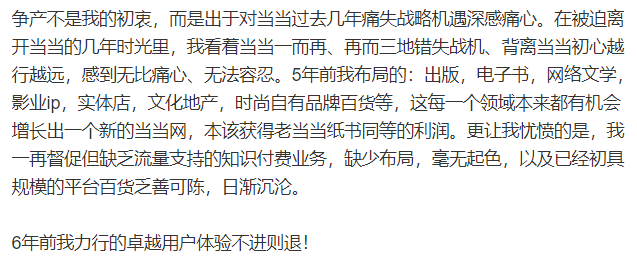在月初发布的公开信中,李总表示争产并不是他的初衷,主要是看到当当再三错失战机,感到痛心难忍。当当在出版、电子书、网络文学、实体店、文化地产及时尚自有品牌百货方面均无建树。