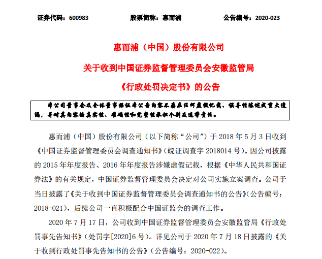 近日,惠而浦(中国)股份有限公司发布公告称,公司收到中国证监会安徽监管局《行政处罚事先告知书》。经证监会调查查明,惠而浦公司存在多起违法违规行为,目的在于虚增2015年、2016年营业收入和利润。
