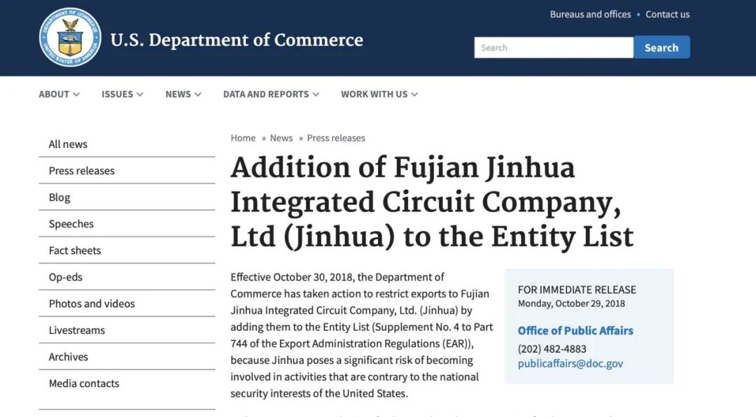 2017年12月,美国镁光科技即刻以窃取知识产权为由开始狙击晋华,晋华也不甘示弱,双方在中国福州和美国加州互相起诉。就当局势焦灼之时,早就虎视眈眈的特朗普政府在2018年10月29日发起了闪电战:将福建晋华列入实体名单,严禁美国企业进行合作。