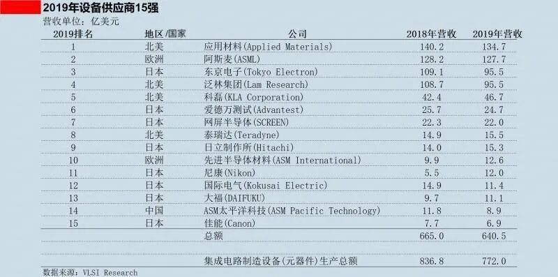 根据2019年全球顶级半导体设备厂商排名,全球前五大半导体设备商占据了全球58%行业营收。其中,美国独占三席;其余两席,一席是日本的东京电子,另一席荷兰的阿斯麦,恰巧,这两家又都是美国一手扶持起来的。