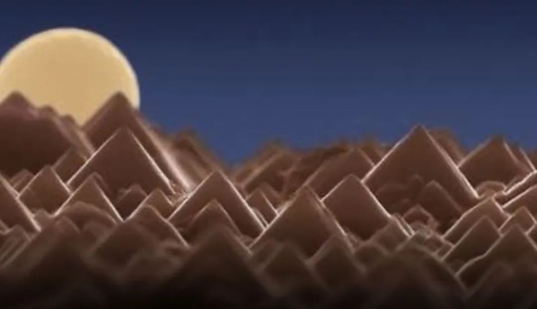 经过刻蚀后的硅表面和锡颗粒,如同明月在金字塔后升起