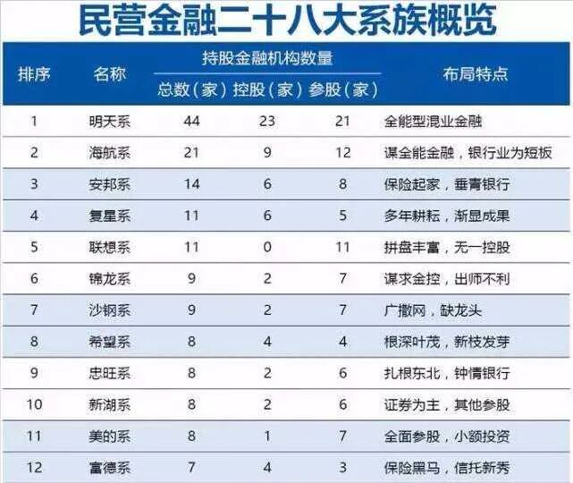 而“明天系”更直截了当,明天控股有限公司就是一家投行,而且“明天系”是控股、参股及曲线持有几十家上市公司,还构建了涵盖证券、银行、保险、信托、期货、PE、基金等机构的完整金融产业链,这也让明天系成为一家持有金融全牌照的民营资本机构。