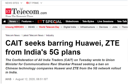 印度《经济时报》12日转引印度-亚洲新闻社报道称,CAIT在信中声称,“应当禁止中国的华为和中兴公司参与印度5G网络部署。此外,在5G网络部署过程中,还应敦促任何(印度)公司都应禁用华为和中兴的技术和设备。”