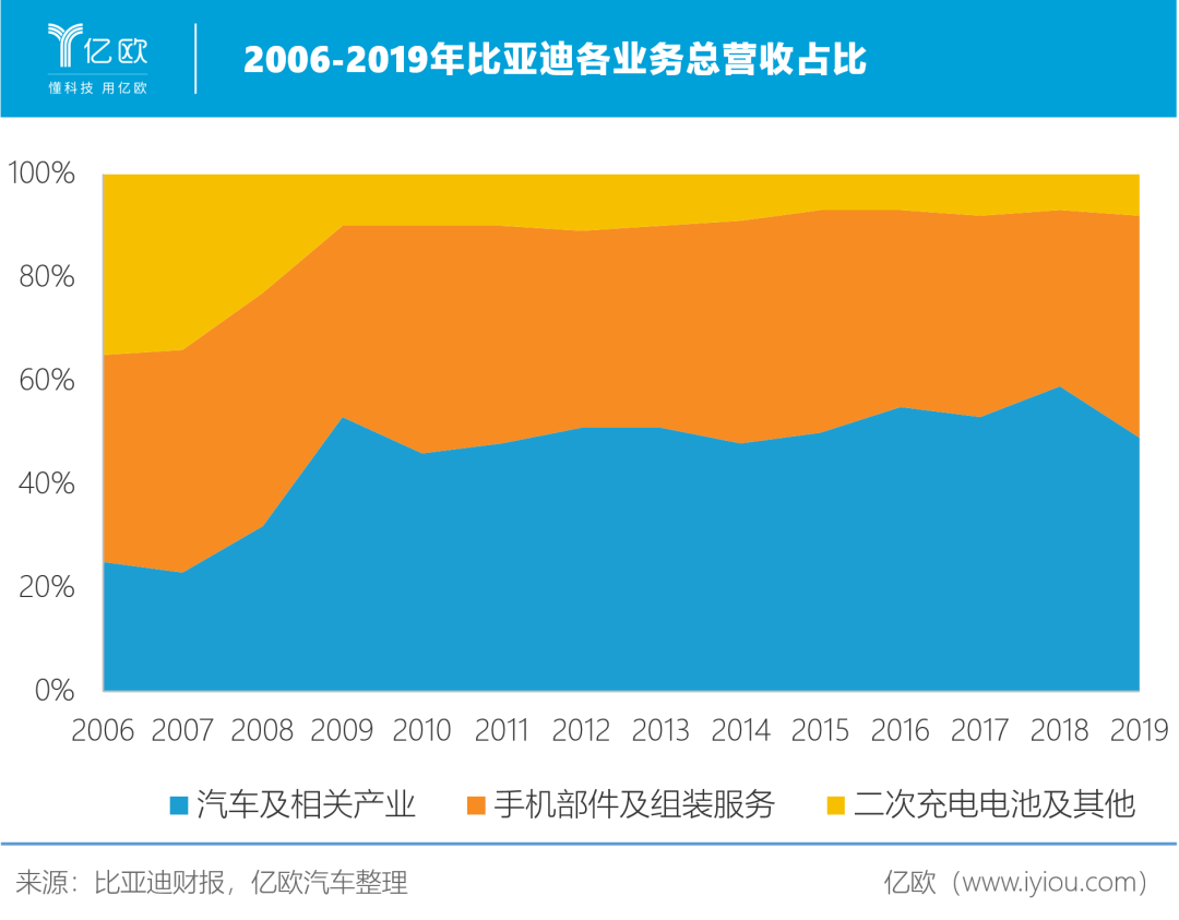 从业务构成来看,比亚迪是汽车制造商+手机组装厂+电池制造商的结合体,其股价是三种业务叠加后的结果。