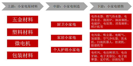 小家电行业的产业链的跨度长,覆盖范围广泛。其上游行业是小家电原材料供应商,中游行业为小家电制造商,下游为各级经销商和最终用户。