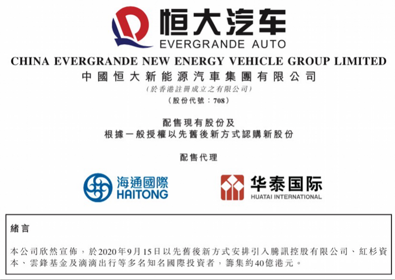 今天(9月15日)上午,恒大汽车发布公告称,公司将以先旧后新方式安排引入腾讯控股有限公司、红杉资本、云锋基金及滴滴出行等多名知名国际投资者,按配售价每股22.65港元,发行1.77亿股配售股份。