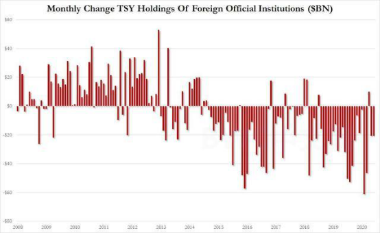 其次,今年3月,美联储推出零利率以及无底线的QE政策之后,向市场注入泛滥的流动性,美元半年时间内一度贬值超过10%,国债收益率也大幅走低。这会导致美元资产遭遇缩水。这同样会加大央行们抛售美债的意愿。