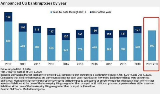 标普全球市场情报统计显示,截至10月4日,美国今年申请破产的较大规模企业达504家,创下10年新高。其中,消费、工业和能源企业占了大头。