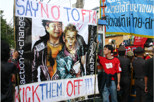 2004年,因担心美国对泰国的农产品倾销,泰国民间爆发反对FTA(自由贸易协定)的抗议活动,海报里右为小布什,左为当时的泰国总理他信。