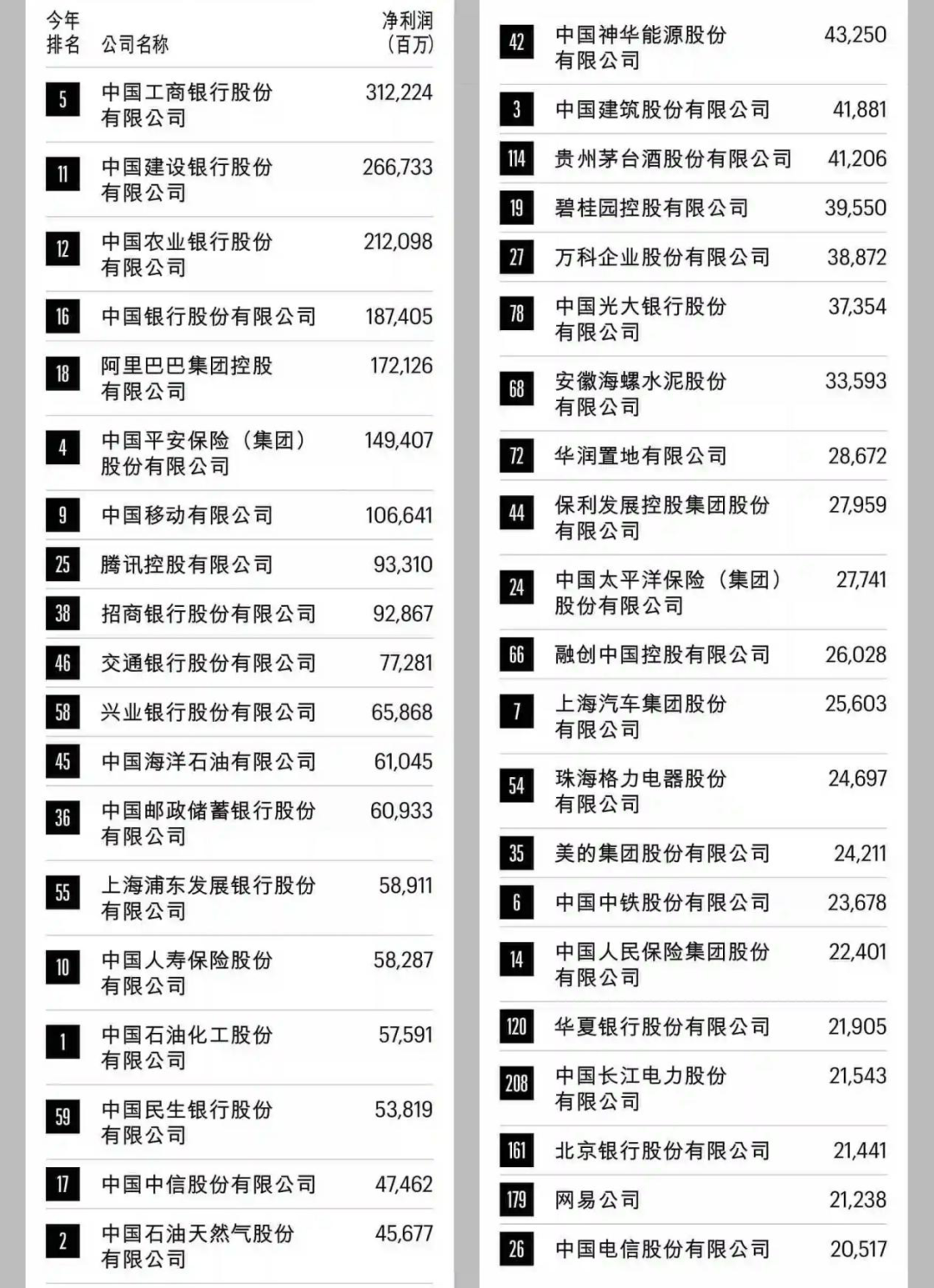 在盈利能力方面,与去年情况相同,最赚钱的10家上市公司除了几大商业银行和保险公司之外,仍是阿里巴巴、中国移动和腾讯。这十家公司去年总利润约为1.7万亿元,接近全部上榜公司利润总和的40%。